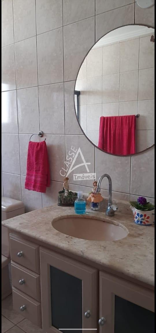Banheiro social com gabinete, pia, espelho, box de vidro e acessórios