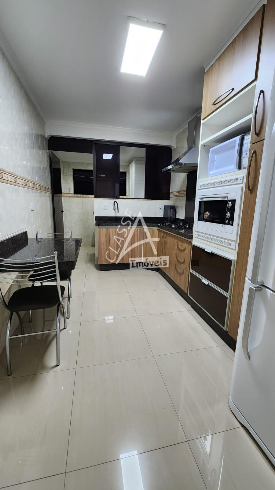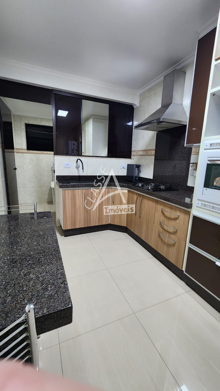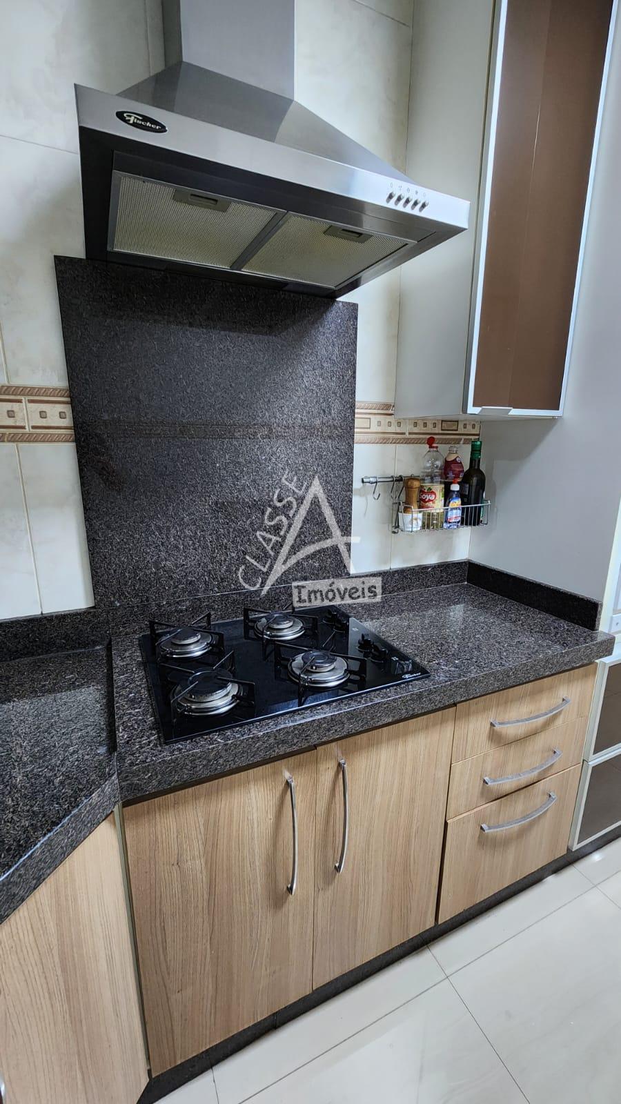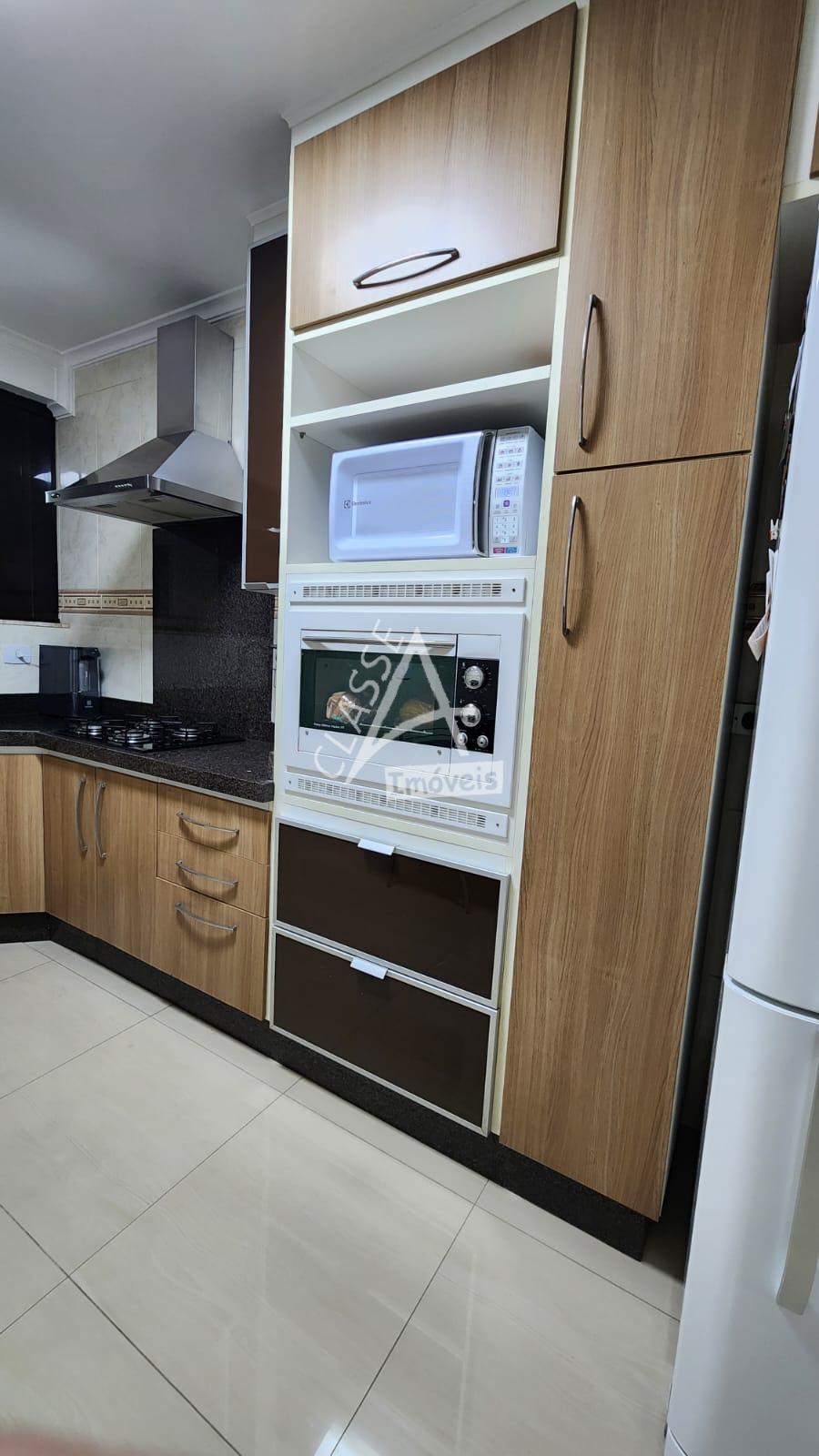 Cozinha com móveis planejados, fogão, forno e depurador;